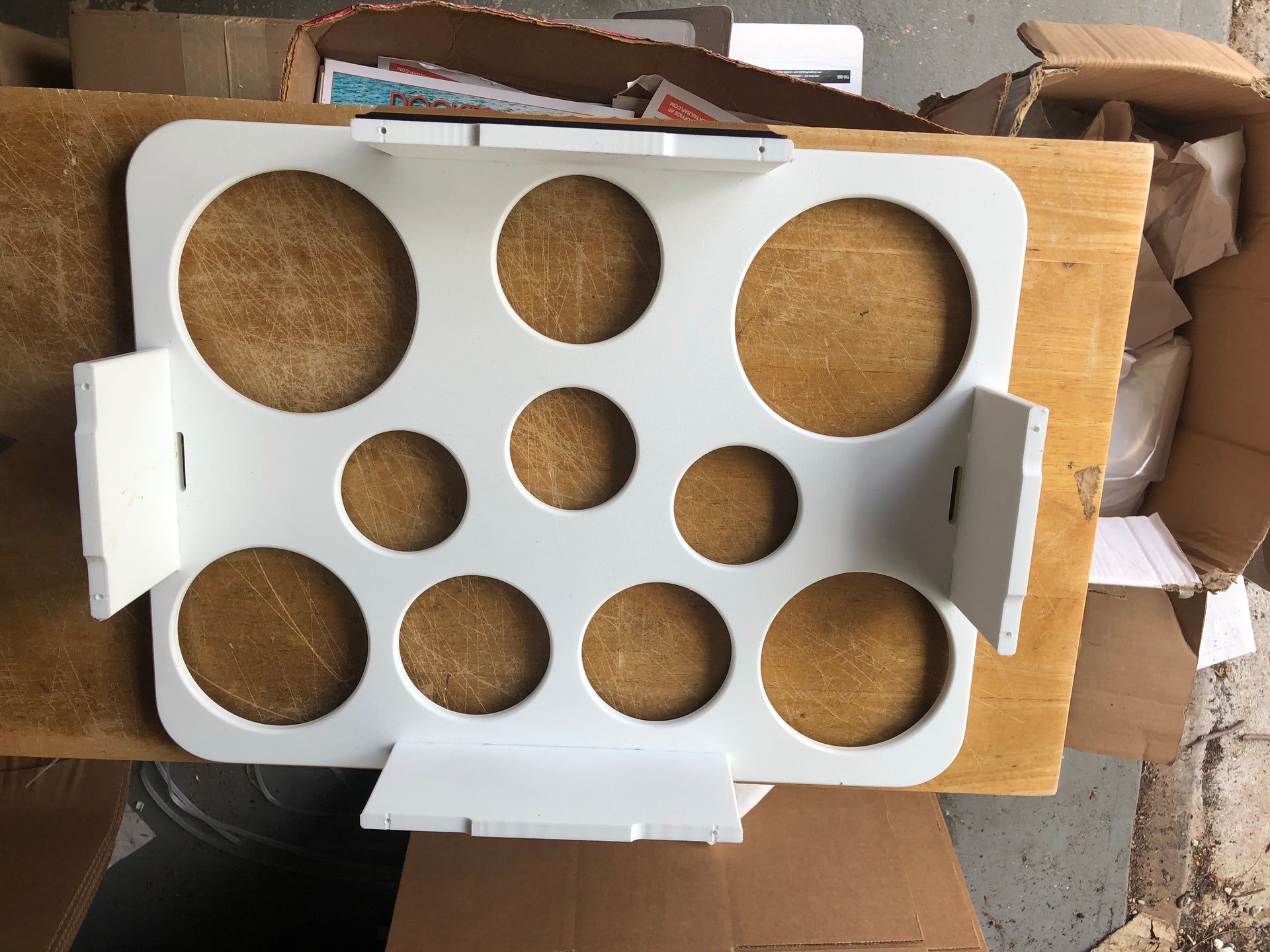 - Push Out and remove any cut outs that are blocking bottle slots and cut outs you will be using. This includes the holes covering the screw holes where you will be attaching your mount.