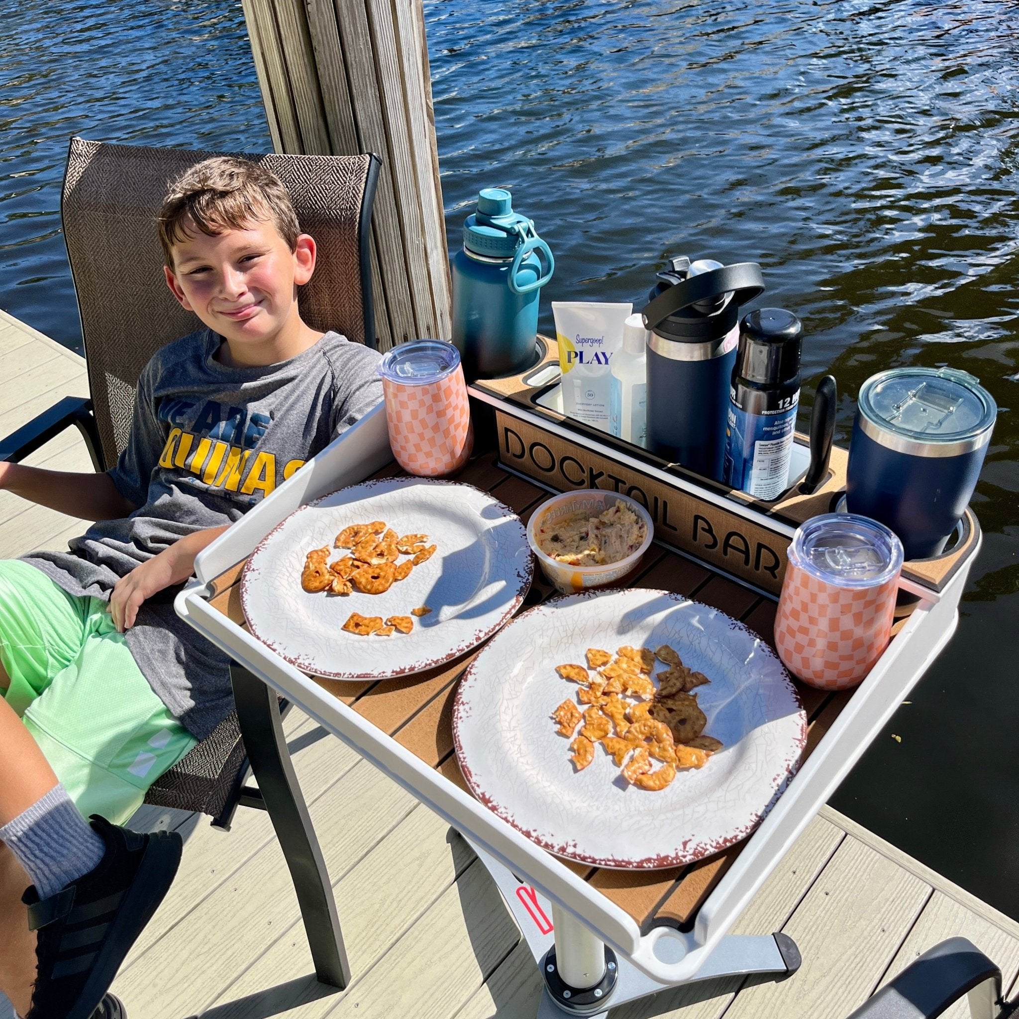 The Butler does it all! Organizes and stabilizes cups, snacks, plates, sunscreen, phones & sunglasses.
